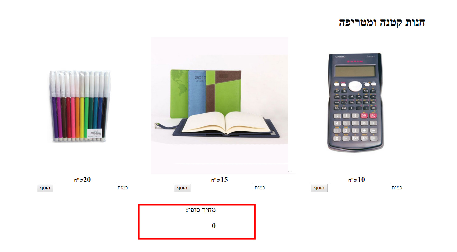 לחיצה על "הוסף" מפעילה פונקציה שניגשת לשדה המחיר ולוקחת את הערך שבו ולשדה הכמות ולוקחת את הערך המושם בו, מחשבת את המחיר שיש להוסיף ומוסיפה אותו למשתנה הגלובלי ואז שמה אותו באלמנט המחזיק את המחיר הסופי.